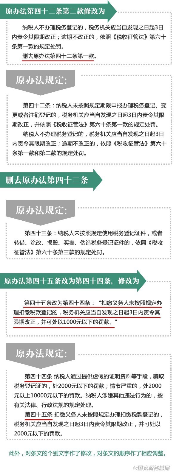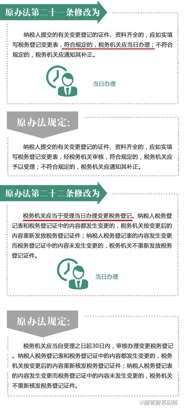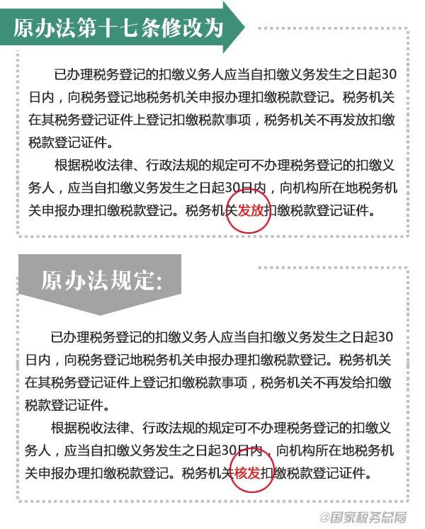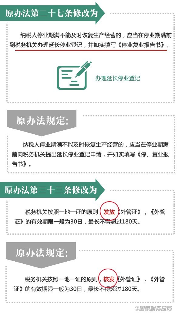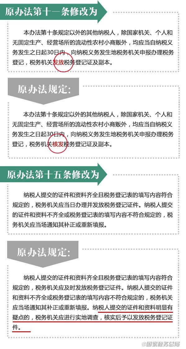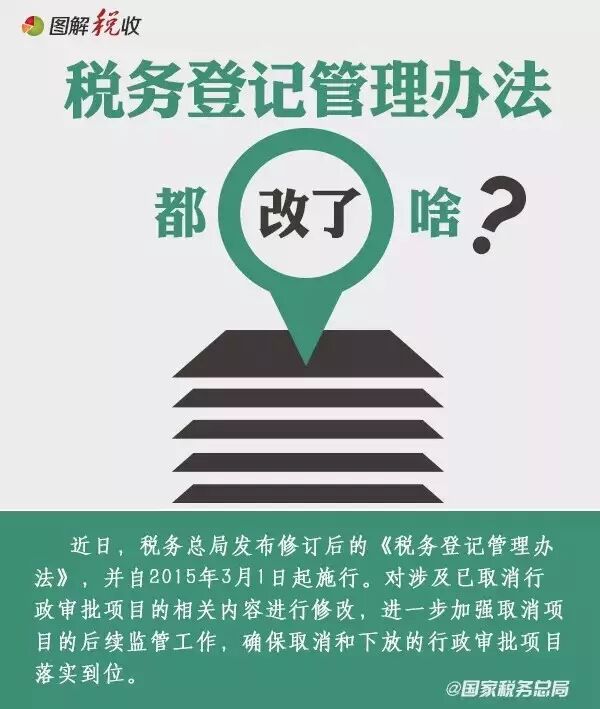 近日,税务总局发布修订后的《税务登记管理办法》,并自2015年3月1日起施行。对涉及已取消行政审批项目的相关内容进行修改,进一步加强取消项目的后续监管工作,确保取消和下放的行政审批项目落实到位。税务登记管理办法都改了啥?